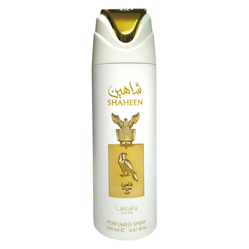 Desodorante corporal Lattafa Shaheen Gold. Este desodorante, parte da linha Pride, vem em spray perfumado, ideal para quem busca uma fragrância fresca e vibrante. Sua família olfativa frutada se destaca com notas de abacaxi e toranja, evocando a alegria e a energia de um dia ensolarado.